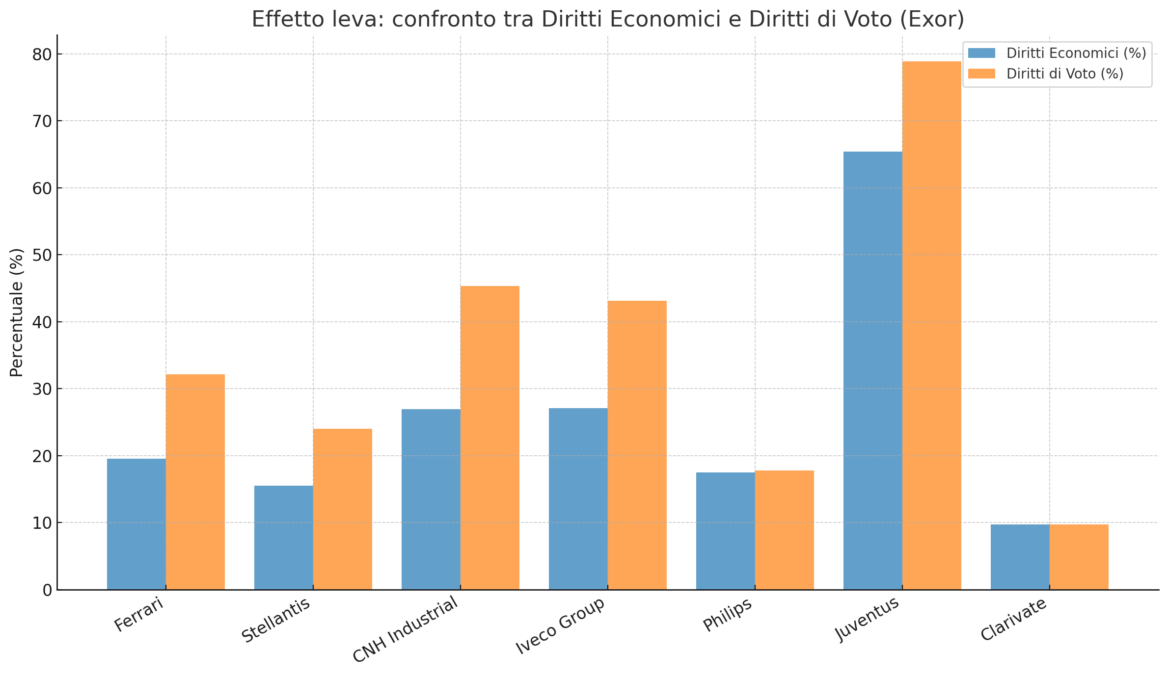 Questi dati mostrano l’effetto leva: con meno del 20% di Ferrari Exor controlla oltre il 32% dei voti; con il 15,5% di Stellantis arriva al 24%; con il 26,9% in CNH sfiora il 45%. In Juventus, con un 65% economico, esercita quasi l’80% dei voti.